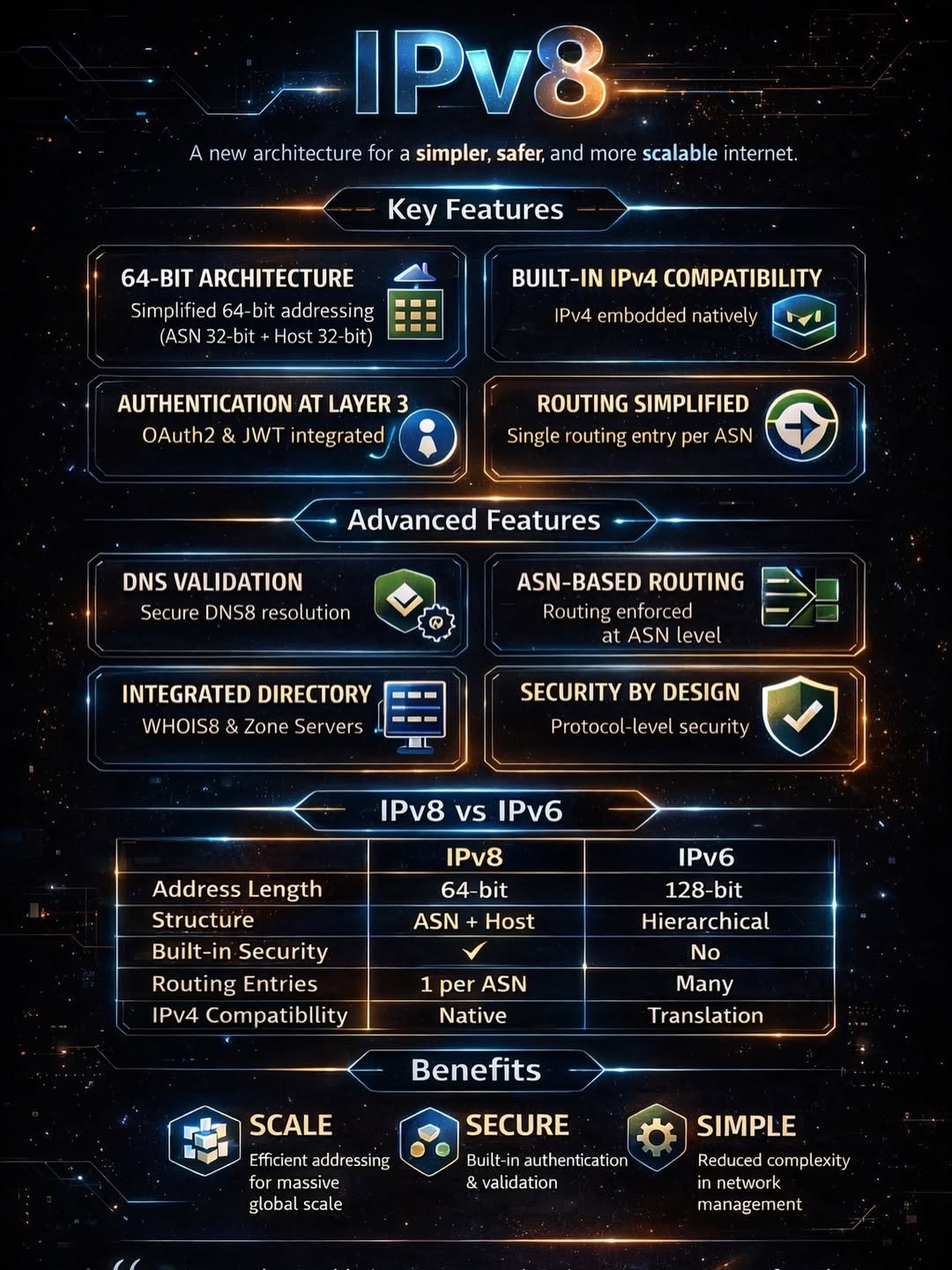 Bajo un esquema de 64 bits y autenticación JWT, la propuesta IPv8 busca unificar servicios críticos y resolver el agotamiento de direcciones garantizando compatibilidad total con IPv4 y reemplazar el formato de arquitectura IPv6.